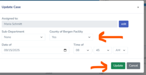 In the Update Case window, switch County of Bergen Facility from No to Yes and select the green Update button.